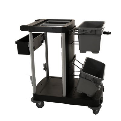 Flexible open cleaning trolley with 2 compartments and a 2-bucket mop system with vertical press.