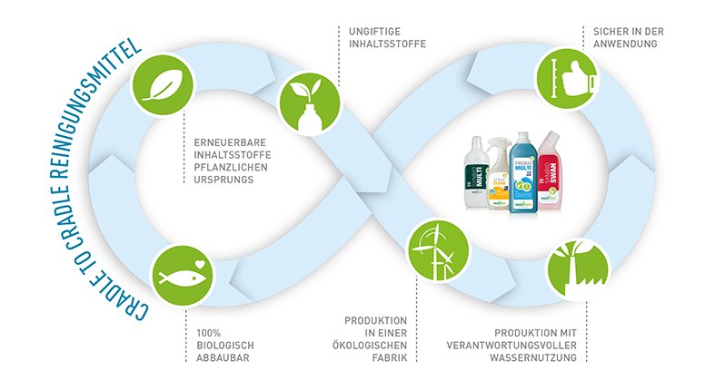 Mit unseren Cradle-to-Cradle-Reinigungsmitteln und unserem 100 % zirkulärem Microfasertuch Re-belle sind wir in diesem Bereich führend.