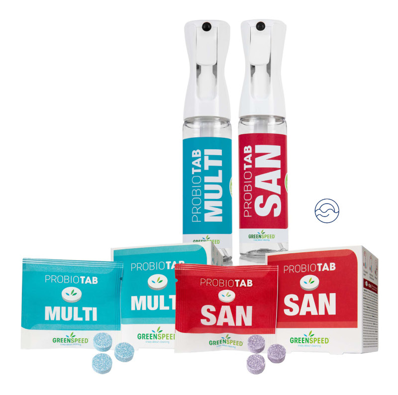 Probio Tab Multi and Probio Tab San are cleaning tablets for your interior and sanitary cleaners. Thanks to the efficient tablet shape we do not have to transport unnecessary water. This saves up to 99% CO2 during transport and up to 99% in storage space!