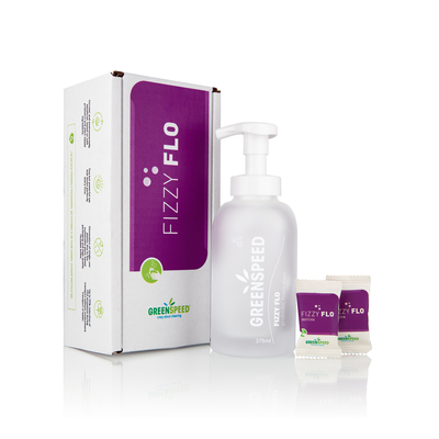 Fizzy Flo - navulbare fles met schuimpomp + 2 tabs Probiotische schuimzeep in tabletvorm met matcha parfum.